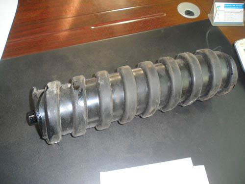 螺旋橡膠托輥是引進國外先進技術(shù),針對化工行業(yè)固體粘濕物料輸送時存在嚴重問題開發(fā)研制的科技成果.我公司專業(yè)從事皮帶機螺旋橡膠托輥的制造和銷售,該產(chǎn)品在國內(nèi)享有千家的用戶,還遠銷東南亞各國。該產(chǎn)品的問世,從根本上解決了帶式輸送機普遍存在的腐蝕,粘輥、膠帶跑偏和撕裂等嚴重問題。具有結(jié)構(gòu)新穎、安裝維修方便、自定中心輸送平穩(wěn)、不粘輥、噪音小,能耗低及延長膠帶使用壽命特點。填補了國內(nèi)空白,并被多家部屬化工設(shè)計院納入通用設(shè)計規(guī)范。